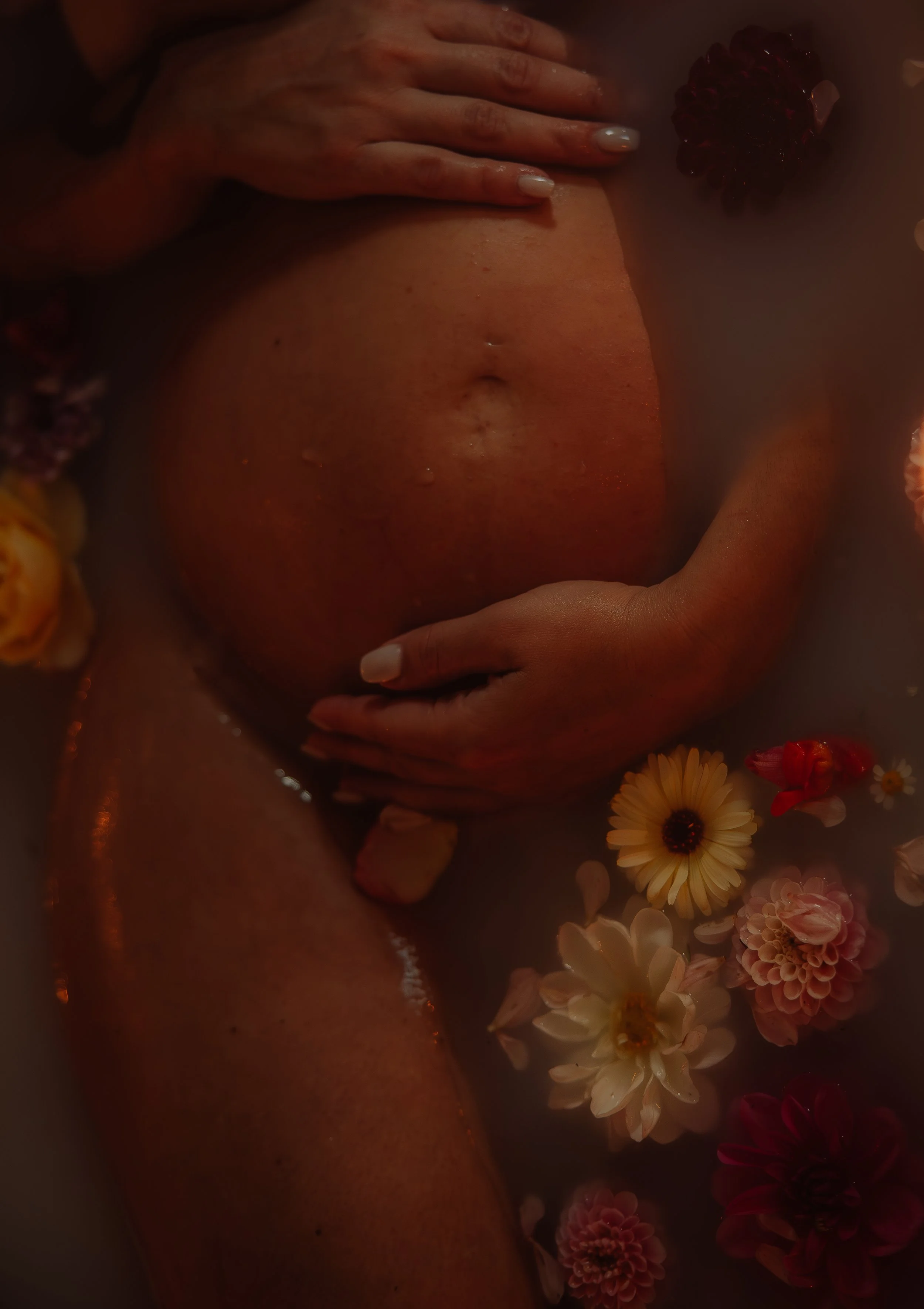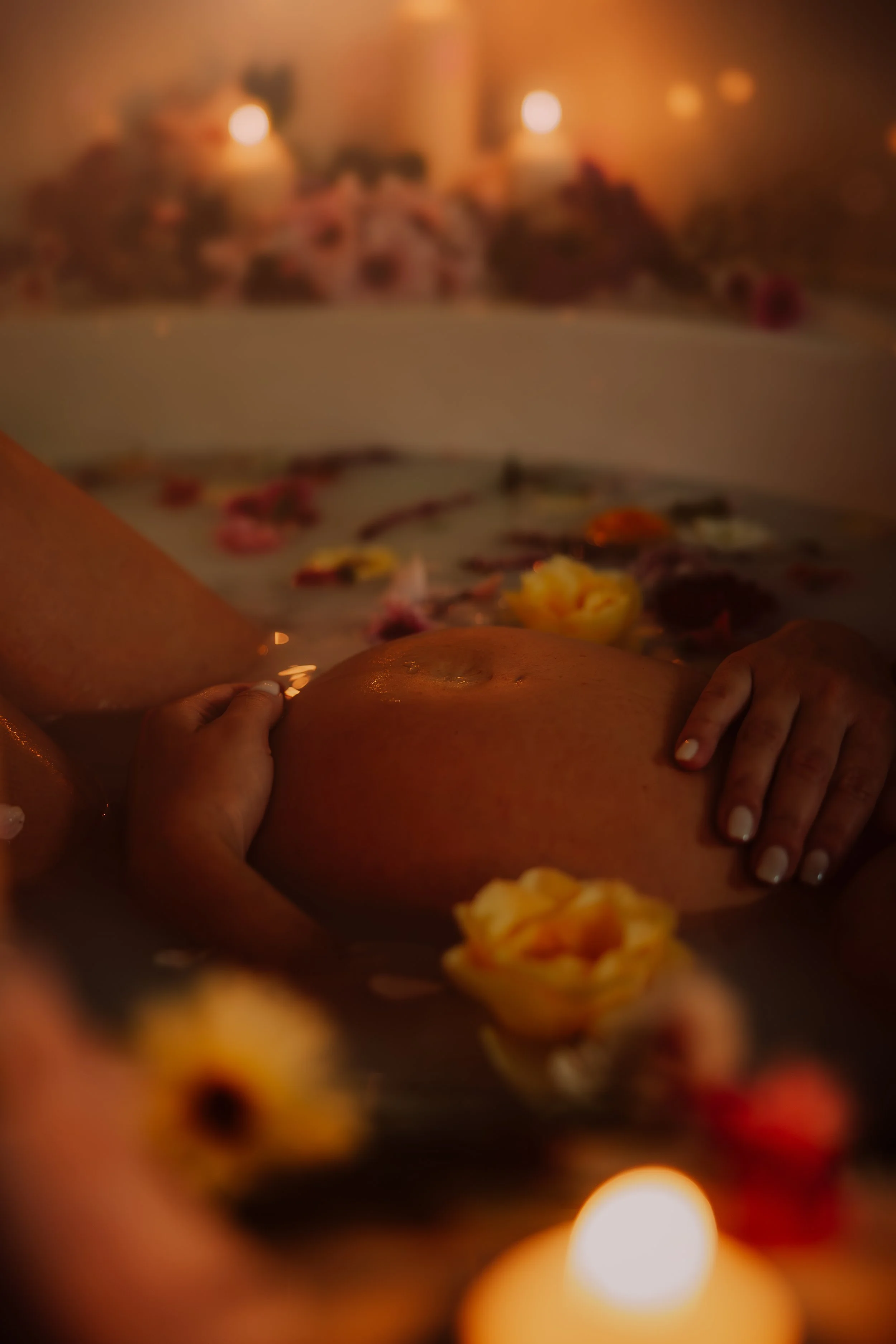To close the session, we created a stunning milk bath setup, complete with floating blooms and the warm glow of candlelight. What was once a regular bathroom became something sacred: a space to pause, reflect, and honour the feminine power of creation.